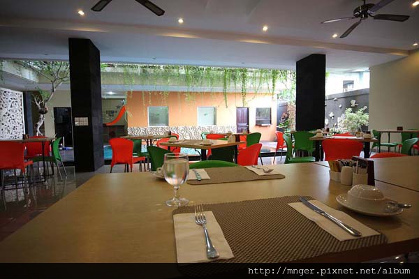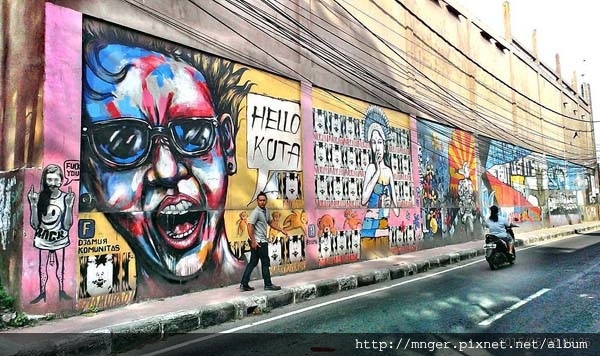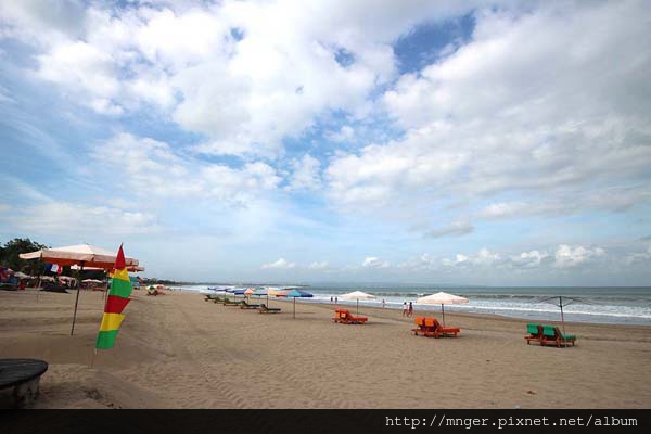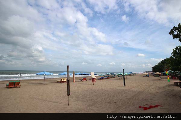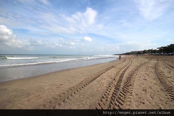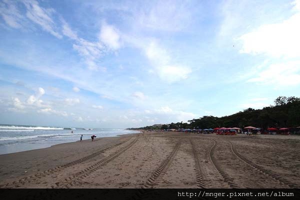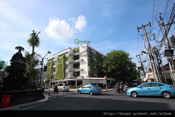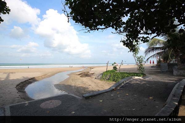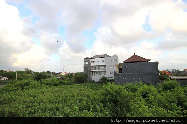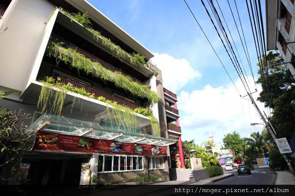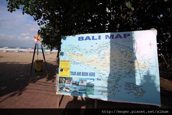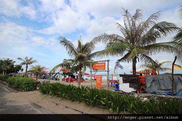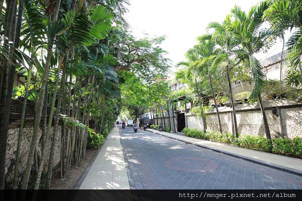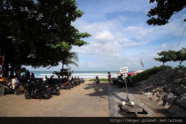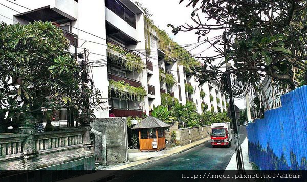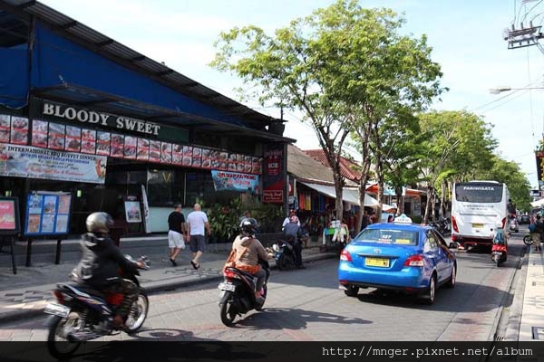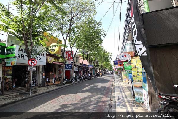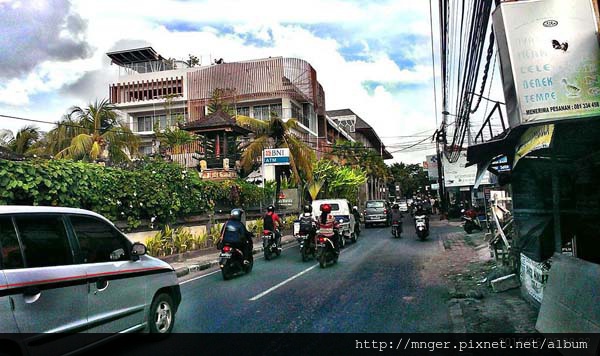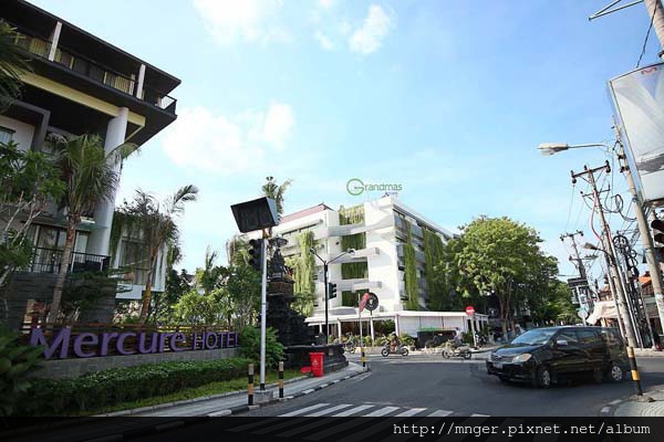 9.騎到北庫塔南段起始點、今天早上走路有經過的雷吉安區的美居酒店Hotel Mercure Bali Legian時,發現這邊還是前方擋住、只有單向、只能往左轉騎下去,沿著路開始進入轉彎,然後我就搞混方向,有往左或往右的路,因為機車汽車多到塞車,我也沒辦法及時看路標和思考,就只好順向往左邊騎,不過先經過一小段荒涼的地方,接著來到熱鬧一些的地方--跟剛剛一樣用手機定位,但只能確定我應該是走錯方向,看看時間都已經快九點,想說乾脆直接在旁邊看到的攤販吃一吃東西算了,不過又覺得應該不難找到我要去的鬧區、所以反向再騎回去,不過回程又不知道騎去哪邊,並沒有經過剛剛的大彎道,雖然有看到路標,不過也是指大方向,我也有點混亂了,最後騎一騎又覺得不對勁,一定位,看到又往更南、快往機場方向走,心裡更急、想說越想走回去反而離越遠,感覺已經累了,也不想找鬧區、只想先找到主要幹道,吃的東西到時候再說,於是又掉頭、最後也忘了怎麼走,跟著車流,來到比較熱鬧的地方,定位雖然有往北邊移動了,但又不知道怎麼騎到這邊,再騎一段發現路旁其中一間飯店就又是Mecure Hotel,但看起來跟剛剛的那家不同啊,也想說是不是來到剛剛那間的背面,不過網路一看,原來這邊還有一間,但重點還是要趕緊找到路,現在騎到這邊的唯一優點就是確定自己在哪條路上、且已是在最左邊的道路上,因此只要到時候找地方右轉、騎一段路後就能遇到主要幹道、再左轉就可以了;最後沿著這條路走到底順著路右彎,然後騎一騎,遇到一個路口發現左前方是最早看到的Mercure Hotel,也就是說我來到剛剛在這邊開始迷路的那個單向路出來的地方,因此這邊就是主要幹道,但又來不及左轉,所以騎過去一點後就找地方、找時機掉頭、再右轉,然後終於回到主要的幹道上,稍微鬆了一口氣,然後往北邊騎去。