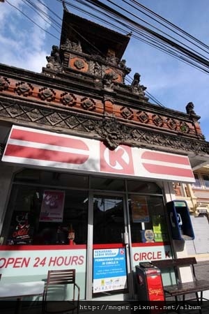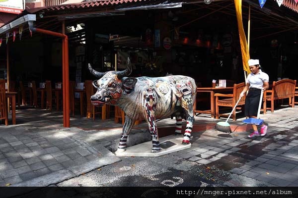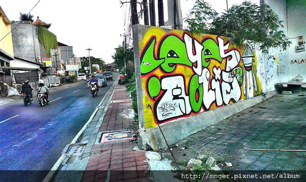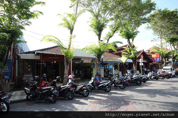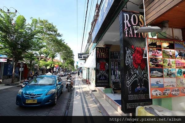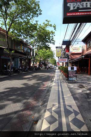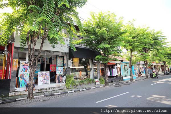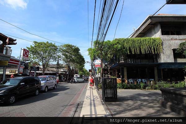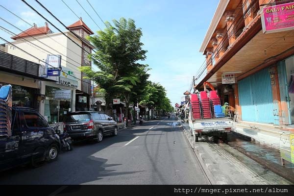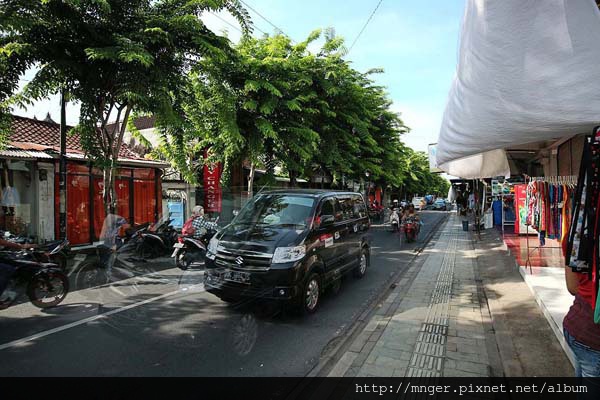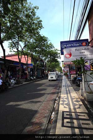 8.回到住處稍微休息一下,決定不要點villa的食物,想說不能就這樣搞不清楚路,一定要試著找到可以到主要幹道的路,並且想騎去昨天被誤載到鬧區的那邊晃晃--感覺很多吃喝、可以用晚餐的地方、也是熱鬧、可以稍微體驗一下夜生活的地方;看看時間也不早了,沒多久,約七點半又騎車出發--沒有什麼主意要怎麼騎,就沿著外頭相對較大(也不過勉強兩台車寬、像我們鄉間道路)、這區主要的路騎著,想說騎看看能通到哪裡,中間有遇到十字路口,但猶豫後還是試著繼續騎下去,騎了有一段距離,騎到最後到底,順向往左轉騎,沒幾下就停下拿手機定位一看--蝦咪!這邊就是主要幹道,還問了旁邊攤販路名確認無誤,問了往鬧區的方向是反方向後,就掉頭往另一方向騎,並在路口時拍個照、以免到時候騎回來又忘了要在哪邊左轉;繼續騎、遇到紅綠燈時,往左邊看看--啊這就是昨天從烏布被載來時看到的很多玻璃燈飾的店家,太好了,我這樣就大概知道我現在的位置以及剛剛鑽出來的地方離這並不遠;再往前騎一段就到了昨天住處那條路的路口,但這次就不左轉進去、而是繼續往前騎。